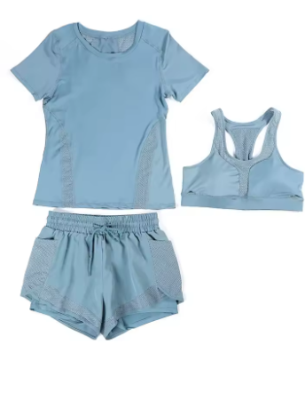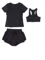 يتم تصميمه بعناية لتلبية احتياجات المرأة العصرية التي تمارس الرياضة أو الأنشطة البدنية بشكل يومي. يتكون الطقم من حمالة صدر رياضية، شورت بخصر عالٍ، وقميص قصير الأكمام، جميعها مصممة لتوفير أقصى درجات الراحة والدعم أثناء التمرين.