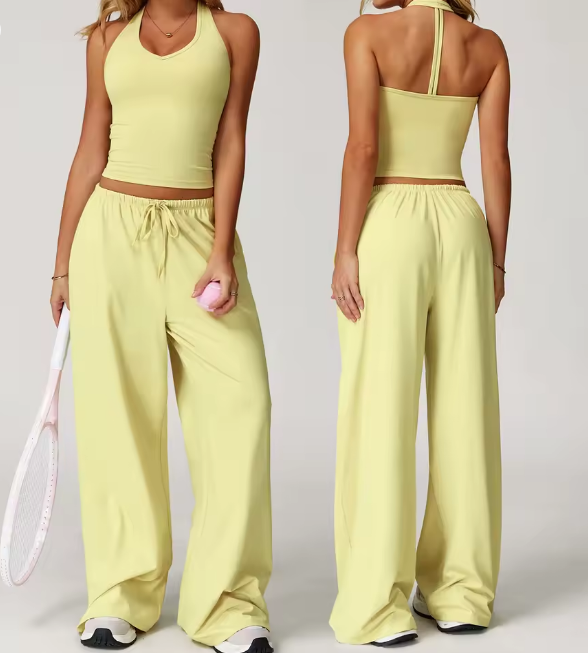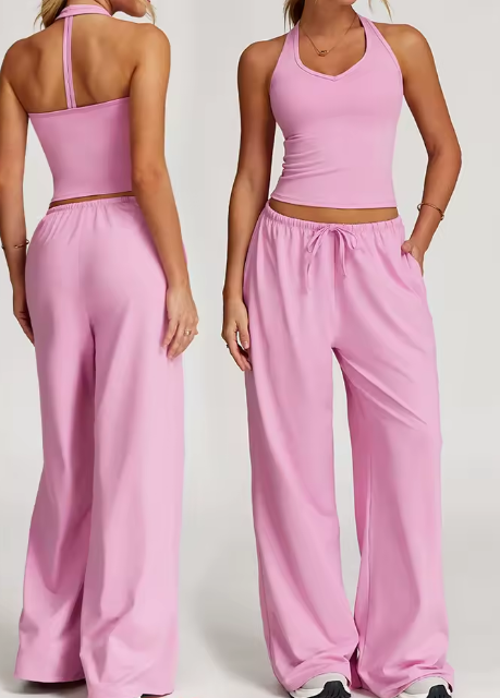 بدلة رياضية نسائية تجمع بين الأناقة والراحة، لتمنحك إطلالة عصرية مثالية في التمارين الرياضية أو حتى في الإطلالات الكاجوال اليومية. تتميز بتصميم عملي مكون من توب قصير بحمالة عنق عصرية يمنح حرية الحركة، وبنطال واسع بأرجل مستقيمة مع خصر مطاطي قابل للربط لضمان ثبات مريح يناسب جميع المقاسات.